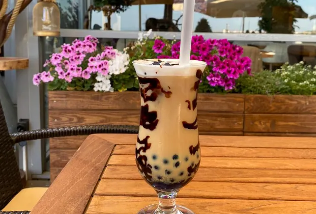 Mango suyu, Çilek Şurubu, Soda, Buz, Mangolu Bubble Tea